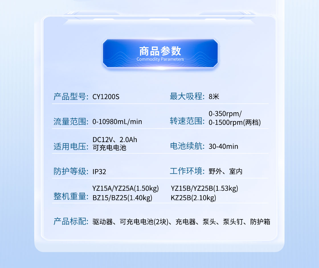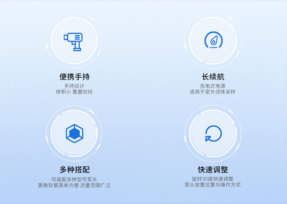 ●可装配YZ15、YZ25、BZ15-14、BZ15-16、BZ25与KZ25等六种型号泵头,适配多种规格软管,流量范围大,可灵活采样。